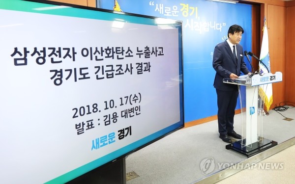 | ▲ 17일 오전 경기 수원시 경기도청 브리핑룸에서 김용 경기도 대변인이 삼성전자 이산화탄소 누출사고 긴급조사 결과를 발표하고 있다.(사진제공=연합뉴스) | ||