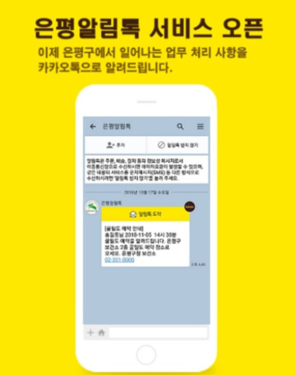 단, 이 서비스는 은평구청의 안내를 받아야 하는 주민에게만 발송되는 것으로, 구는 카카오톡을 설치하지 않았거나 알림톡 서비스를 원하지 않아 ‘알림톡 차단’을 한 경우에는 기존처럼 문자메시지(SMS)를 통해 안내할 방침이다.