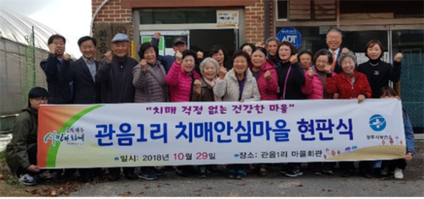 30일 시에 따르면 이날 치매안심마을로 지정된 관음1리는 노인인구 비율이 20.59%로 광주시 전체 노인인구 비율 11.49%보다 2배 가까이 높다. 또한 퇴촌면 관음리 인근에는 보건진료소, 노인주간보호센터, 요양병원 등의 유관기관이 위치하고 있어 치매안심마을로 선정됐다.