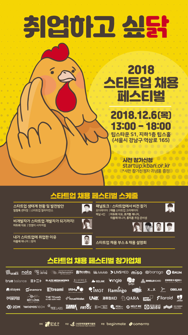(사)한국엔젤투자협회와 함께 진행하는 이번 행사에는 굿게임즈, 우아한형제들, 바로고, 쿠엔즈버킷, 힉스컴퍼니 등 49개 업체가 참여한다.