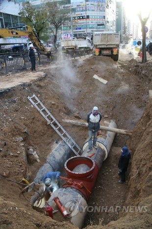 | ▲ 5일 오전 고양시 백석역 근처에서 전날 저녁 발생한 지역 난방공사 온수 배관 파열 사고와 관련 작업자들이 복구작업을 하고 있다. /연합뉴스 |