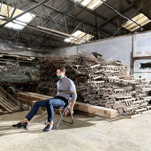 사진 속 오창석은 네이비색 스랙스에 하늘색 셔츠를 입고, 폐공장 안 의자에 묶여있다. 입에는 청테이프를 붙이고 있어, 누군가에게 납치된 모습이다. 이어진 사진에서는 각도를 바꿔 오창석의 오른편에서 오창석을 찍었다.