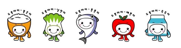 | ▲ 최근 도봉구 어린이급식관리지원센터에서 개발한 ‘도봉아이’ 캐릭터 5종. 왼쪽부터 불끈이(밥), 날씬이(배추), 튼튼이(생선), 예쁜이(사과), 쑥쑥이(우유). (사진제공=도봉구청) | ||