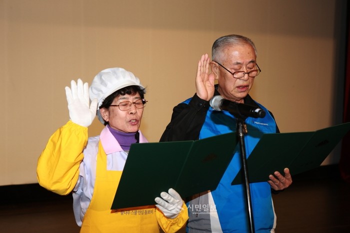 | ▲ 지난 2일 강북구는 '2015년도 노인 사회활동지원 사업 발대식'을 개최했다. 사진은 이날 발대식에서 참여자 대표들이 선서하고 있는 모습. (사진제공=강북구청) | ||