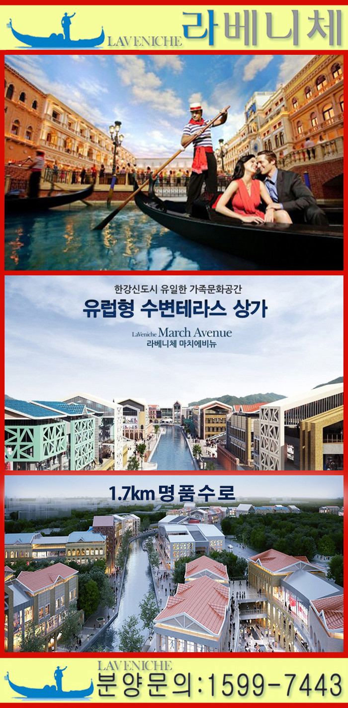 이탈리아 베니스를 motive로 한 김포 ‘라베니체 마치 에비뉴 수변테라스상가’가 연일 화제이다 국내 스트리트형 상가 중 가장 긴 '라베니체 마치 에비뉴'는 왕복 1.7㎞의 수로를 따라 총 3만3000㎡ 면적에 들어서는 대규모 상업시설이다 1차 분양을 조기완판하고 3.3㎡당 2300만원대로 주변 상가들에 비해 약 200~500만원 정도 저렴하게 2차(57실)·3차(40실)분을 분양 중인 이 상가는 이탈리아 베니스 모습을 테마로 잡아 공간을 꾸몄다. 기반시설(상권)조성에 박차를 가하고 있는 김포한강신도시에 위치한 이 상가는 상권의 조기 활성화를 위해 임대인에게는 1년간 일정 수익을 시행사가 선지급하고 임차인에게는 1년간 무상으로 점포를 대여하는 것이 특징이다 한강신도시는 개발 완료단계 완성형 신도시이다.