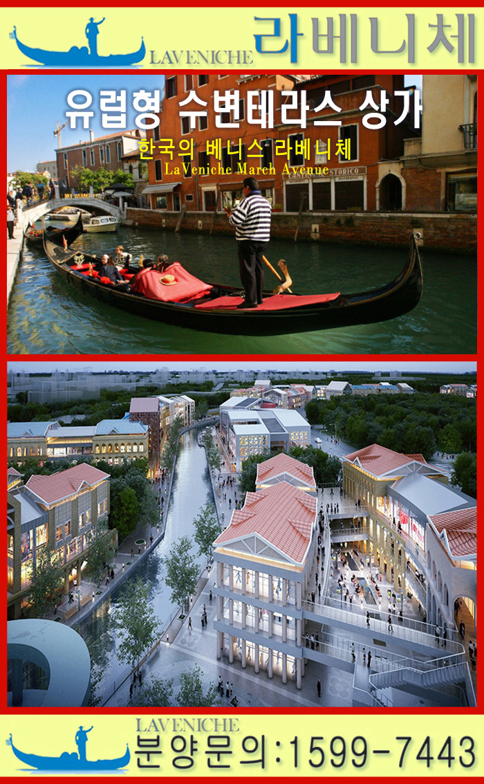 이탈리아 베니스를 motive로 한 김포 ‘라베니체 마치 에비뉴 수변테라스상가’가 연일 화제이다 국내 스트리트형 상가 중 가장 긴 '라베니체 마치 에비뉴'는 왕복 1.7㎞의 수로를 따라 총 3만3000㎡ 면적에 들어서는 대규모 상업시설이다. 1차 분양을 조기완판하고 3.3㎡당 2300만원대로 주변 상가들에 비해 약 200~500만원 정도 저렴하게 2차(57실)·3차(40실)분을 분양 중인 이 상가는 이탈리아 베니스 모습을 테마로 잡아 공간을 꾸몄다. 기반시설(상권)조성에 박차를 가하고 있는 김포한강신도시에 위치한 이 상가는 상권의 조기 활성화를 위해 임대인에게는 1년간 일정 수익을 시행사가 선지급하고 임차인에게는 1년간 무상으로 점포를 대여하는 것이 특징이다 한강신도시는 개발 완료단계 완성형 신도시이다.