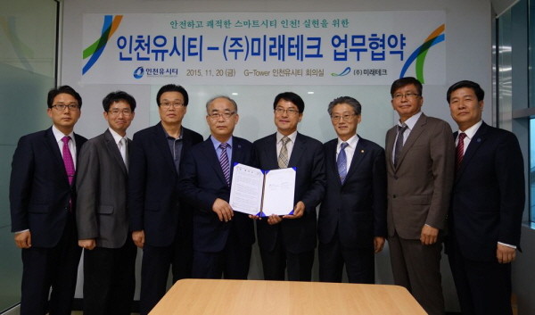 인천유시티(대표 이인우)는 최근 하이브리드 가로등 전문생산업체인 ㈜미래테크(대표 박희천)와 신재생에너지를 활용, 쾌적하고 안전한 스마트시티 구축방안을 마련하기 위한 업무협약식을 가졌다고 20일 밝혔다.