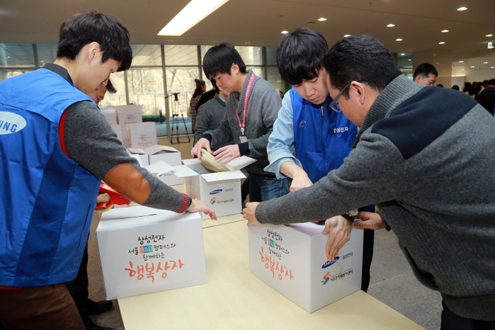 지난 2일 서울 서초구는 우면동에 위치한 삼성전자 서울R&D캠퍼스 임직원들과 함께 양재동 취약계층의 풍성한 설맞이를 위해 건강 먹거리와 생활필수품 등으로 구성된 ‘행복상자’ 만들기 자원봉사 활동을 진행했다.(사진제공=서초구청)