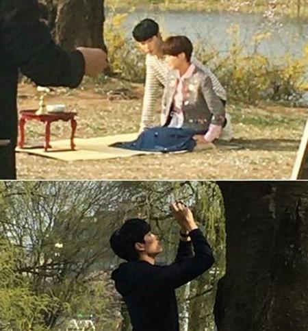 사진 속에 황정음과 류준열은 벚꽃나무 아래에서 소반에 정화수를 떠놓고 있는 모습이다. 이어 공개된 사진 속에서 류준열은 무언가를 촬영하고 있어 보는 이들의 궁금증을 자극하고 있다.