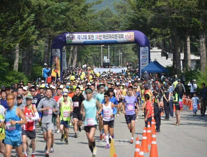 지난 22일 경기 포천시 5군단 화랑연병장에서 개최된 제12회 포천38선 마라톤대회가 4200여명이 참여한 가운데 성황리에 마쳤다. 사진은 대회 참가자들이 출발선을 통과해 힘차게 달리고 있는 모습.(사진제공=포천시청)