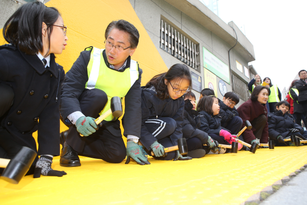 옐로 카펫은 횡단보도를 건너기 전 대기 공간의 시인성을 높이기 위해 길바닥에 붙인 노란색 알루미늄 스티커, 노란 발자국은 카펫을 설치하기에는 좁은 공간에 대신 발자국 모양을 붙인 것으로, 어린이들이 예전처럼 차도로 급하게 뛰어나가지 않고 자연스레 노란색 공간에 모이도록 유도해 사고를 줄이는 효과를 얻을 수 있다.