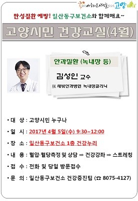 한편 건강강좌는 매월 첫째 주 수요일마다 다양한 주제로 진행이 되며 자세한 사항은 일산동구보건소 건강증진팀으로 문의하면 된다.