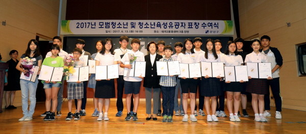 신연희 강남구청장은 지난 13일 대치2문화센터 강당에서 열린 ‘2017년 모범청소년 및 청소년육성유공자 표창 수여식’에 참석해 유공자들에게 표창을 수여했다. 사진은 신 구청장(가운데)과 청소년들이 기념촬영을 하는 모습.(사진제공=강남구청)