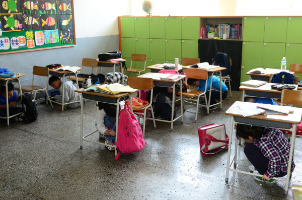 영등포소방서는 지난 11일 오전 영등포구 소재 한국영등포화교소학교를 방문해 지진 및 화재대피훈련을 실시했다. 사진은 학생들이 자기 방호 및 대피 훈련을 하고 있는 모습. (사진제공=영등포소방서)
