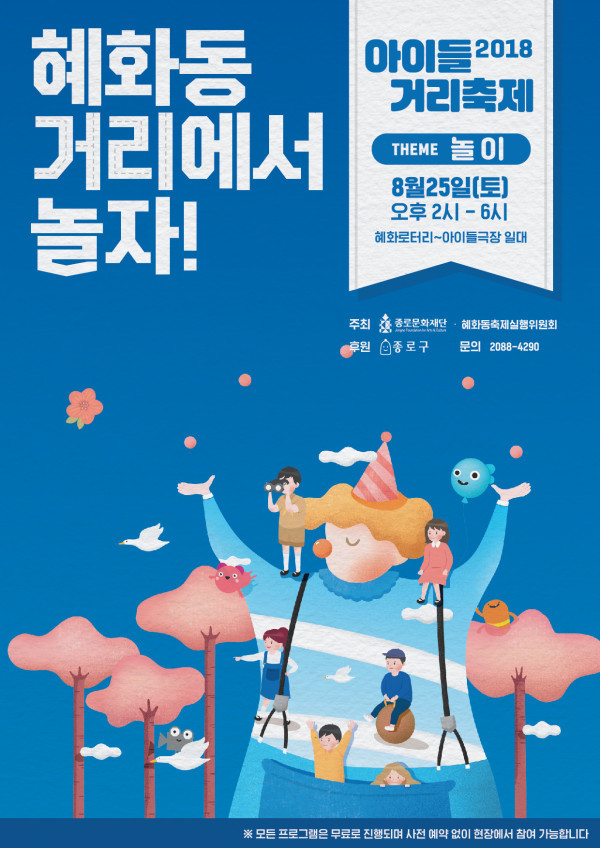 [시민일보=이대우 기자] 종로구(구청장 김영종) 종로문화재단이 오는 25일 오후 2~6시 혜화로터리에서 올림픽기념국민생활관(종로구 성균관로 91)사이의 400m 거리구간에서 2018 아이들거리축제 ‘혜화동 거리에서 놀자’를 개최한다.