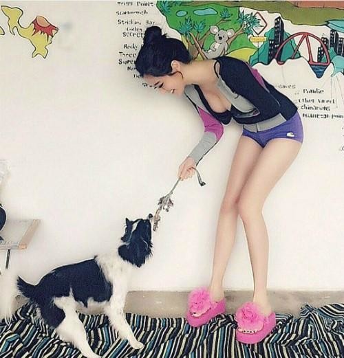 사진 속 홍수아는 초미니 팬츠에 글래머러스한 볼륨감이 돋보이는 상의를 입고 강아지와 놀고 있어 시선을 집중 시킨다.