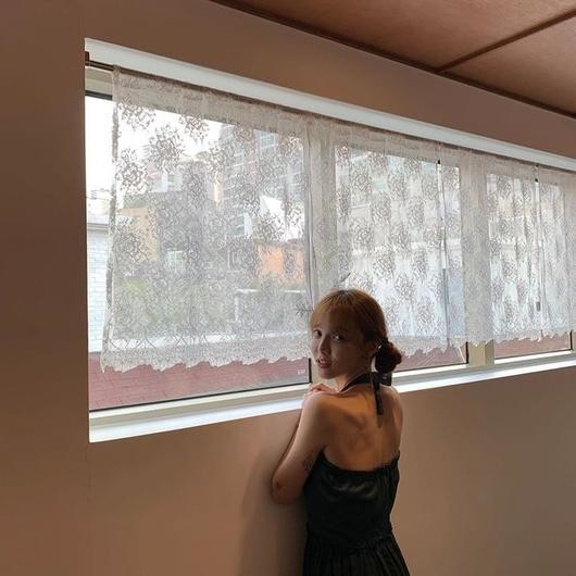 공개된 사진 속에는 등이 드러난 짙은 색 원피스를 입은 지민이 창가에 서서 포즈를 취하고 있는 모습이 담겨 있다.