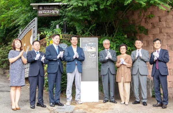 ▲ 최근 삼각지성당 앞에서 열린 '경천애인사 아동원 터 안내판 제막식'에서 안내판 설치 후 성장현 구청장(왼쪽 네 번째)과 내빈들이 기념촬영을 하고 있다. (사진제공=용산구청) |