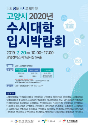 이번 고양시 2020년 수시 대학입시박람회에 참여하는 대학은 가천대, 가톨릭대, 강남대, 경기대, 국민대, 남서울대, 농협대,. 단국대, 대진대, 덕성여대, 동국대, 명지대, 백석대, 상명대, 서울시립대, 서울여대, 선문대, 성결대, 성공회대, 세종대, 수원대, 순천향대, 숭실대, 신한대, 아주대, 안양대, 연세대(원주캠퍼스), 용인대, 을지대, 인천대, 인하대, 전남대, 중부대, 차 의과학대,평택대, 한국산업기술대, 한국외대, 한국항공대, 한서대, 한성대, 한세대, 한신대, 한양대(에리카), 협성대, 호서대(가나다순) 등의 대학이 참여한다.