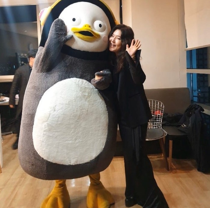 공개된 사진 속 한혜연은 손인사를 하며 EBS 캐릭터 펭수와 카메라를 쳐다보고 있는 모습이다.