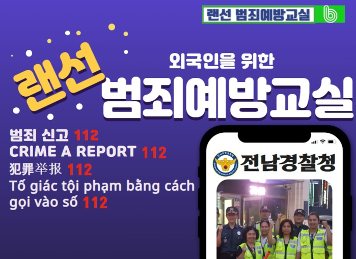 전남경찰은 ‘랜선 범죄예방교실’에 수혜자 중심으로 적시성 있는 외국어 범죄 예방 자료를 지속적으로 업데이트하고, 외국인의 범죄 피해를 예방하기 위한 국적별 치안활동을 확대할 방침이다.