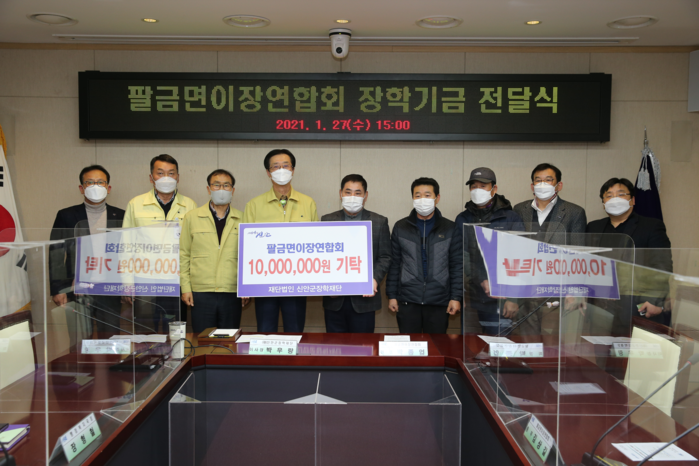 팔금면이장협의회 박종업 회장과 임원들은 27일 신안군청을 방문하여 열악한 환경에서 공부하고 있는 학생들을 위해 사용해 달라며 신안군장학재단에 기탁하였다.