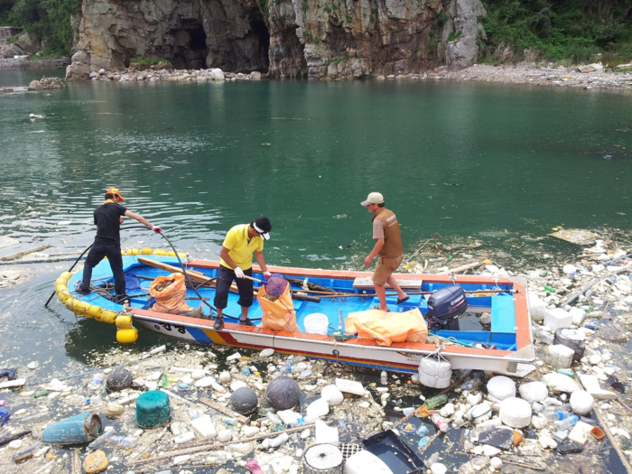 | ▲ 신안군 관광협의회 회원들이 관광지 홍도 해상에서 환경 정화 활동을 펼치고 있다.(출처=신안군 관광 협의회). |
