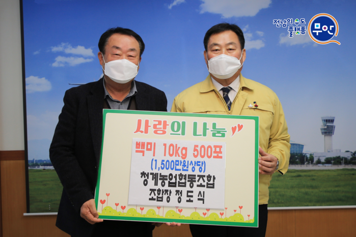 무안군(군수 김산)은 27일 청계농협(조합장 정도식)에서 관내 어려운 이웃들을 위해 백미(10kg) 500포를 기탁했다고 밝혔다.