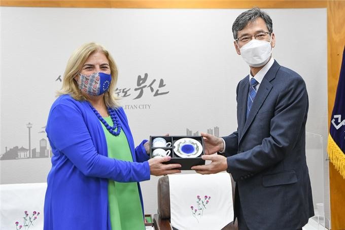 이병진 부산시장 권한대행은 지난 19일 오후 14시 부산시를 방문한 마리아 카스티요 페르난데즈(Maria CASTILLO FERNANDEZ) 주한 유럽연합대사를 접견했다.