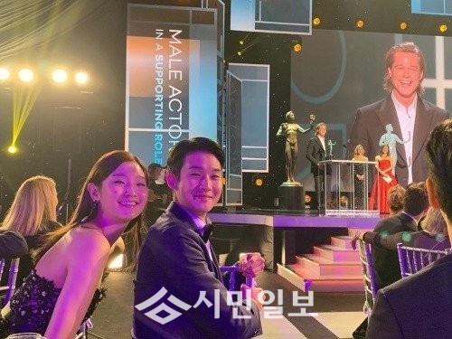 공개된 사진 속 박소담, 최우식은 제26회 미국 배우조합상 시상식(Screen Actors Guild Awards)에서 무대 위에 오른 할리우드 배우 브래드 피트를 배경으로 인증샷을 찍고 있다.