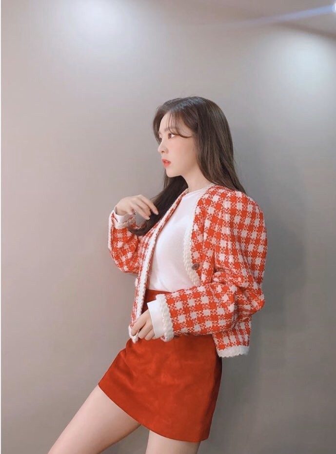 공개된 사진 속 아이린은 레드 체크 톤의 의상을 입고 카메라에 담겼다.