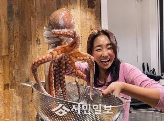 공개된 사진 속 진재영은 커다란 문어를 한 손으로 잡은 채 환하게 웃고 있는 모습으로 이목을 사로잡았다.