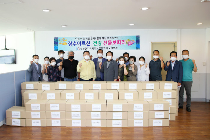 이 사업은 무안군지역사회보장협의체 노인분과에서 추진하는 사업으로 코로나19 장기화에 따라 거동이 불편하여 생계유지에 어려움을 겪고 있는 장수어르신들을 위해 의약품, 생필품, 즉석식품 등 36,000원 상당의 건강 선물 보따리를 직접 제작하여 전달했다.
