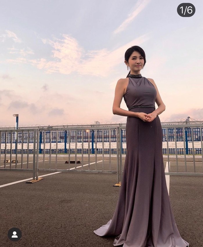 공개된 사진 속 김경란 아나운서는 부산에서 드레스를 입고 카메라를 쳐다보고 있다.