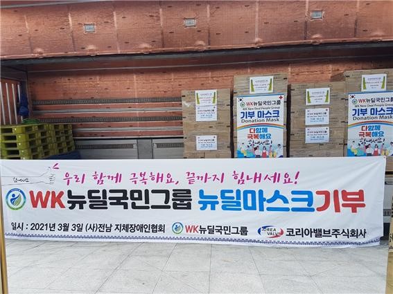 | ▲ WK뉴딜국민그룹이 전남지체장애인협회에 마스크 10만장 기부했다.(출처=전남지체장애인협회) |