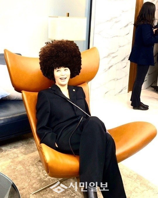 배우 김혜수는 자신의 인스타그램에 "#송&김 #로비 #의자탐난다~ #오늘은 #금자데이 #기대감 #폭발 #폭탄머리 #정금자 #하이에나"라는 글과 함께 한 장의 사진을 게재했다.