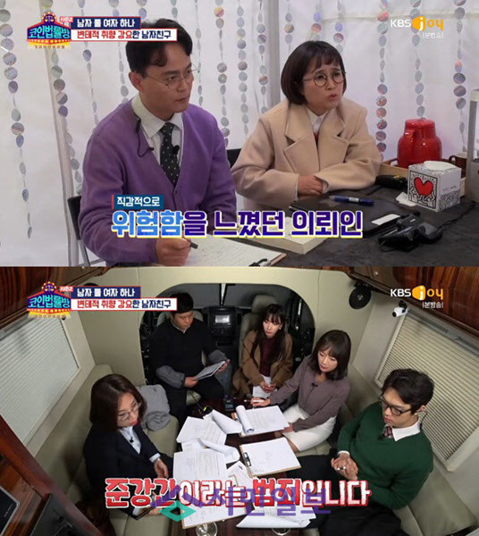 최근 방송된 방송된 KBS 조이 '코인법률방 2'에는 여성 의뢰인 ㄱ씨가 출연해 연인으로부터 각종 변태 행위를 강요받았다는 주장을 펼쳤다. ㄱ씨는 "나를 정신 못 차릴 정도로 만든 다음 모르는 남자를 불러 성관계를 맺도록 강요했다"라고 주장해 시청자들의 공분을 자아냈다. 이어 "남자친구가 제대로 안 했으니 모르는 남자와 또 해야 된다고 말했다"라고 덧붙이며 남자친구의 만행이 한 번에 그치지 않았음을 주장했다.