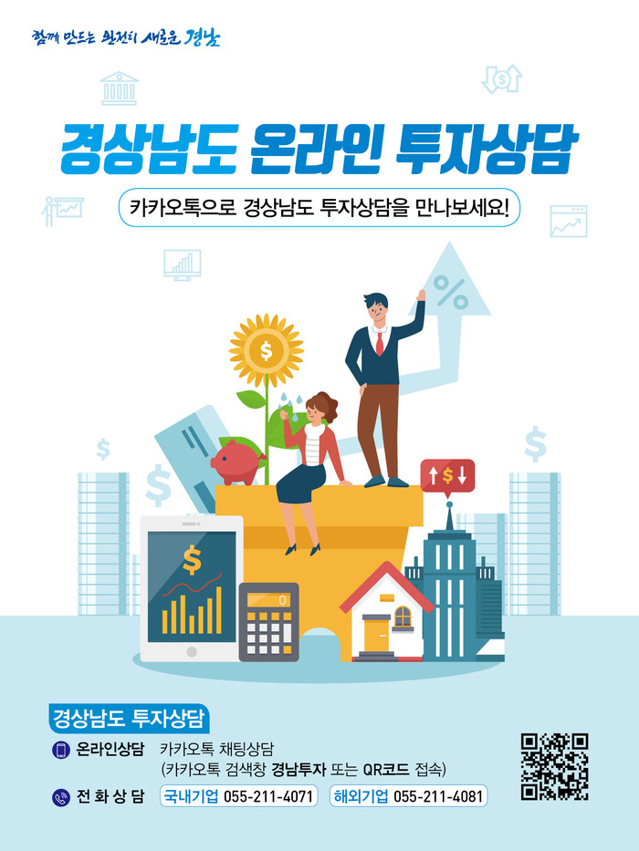 최근 코로나19로 재택근무가 활성화되는 등 비대면 활동이 증가함에 따라 경남도는 스마트폰으로 누구나 간편하고 신속하게 투자상담 서비스를 제공받을 수 있도록 온라인 전담 카카오톡 채널을 개설했다.