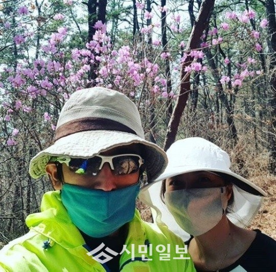 공개된 사진 속 신애라는 남편 차인표와 함께 등산에 나선 모습으로 활짝 핀 꽃을 배경으로 인증샷을 남기며 달달함을 자아냈다.