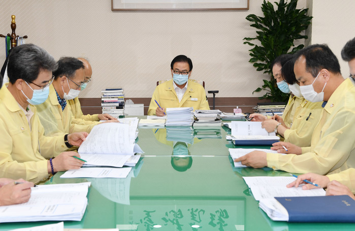 한정우 창녕군수가 휴일을 잊은 채 코로나19 확산 방지에 선제적으로 대응하고 있다. 창녕군에 따르면 정부의 수도권 사회적 거리두기 2단계 격상에 따라 지방정부 차원의 대응방안을 마련하기 위해 16일 오전 9시께 집무실에서 부군수 등이 참석한 주요간부회의를 가졌다고 밝혔다.