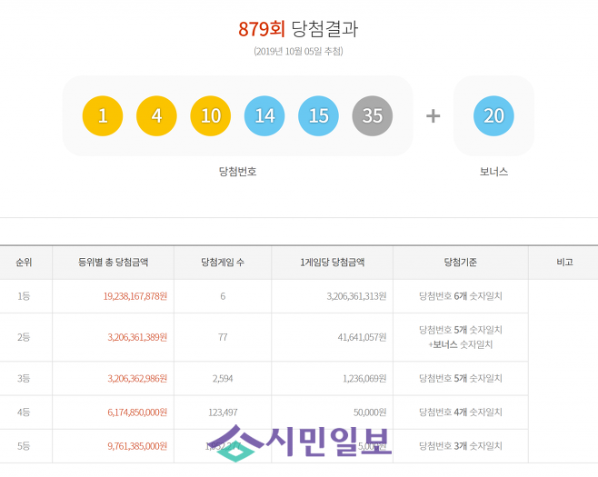 지난 10월 5일 추첨한 제879회 로또 1등 당첨번호는 '1·4·10·14·15·35'으로 발표됐다.2등 보너스 번호는 ‘20’이다.