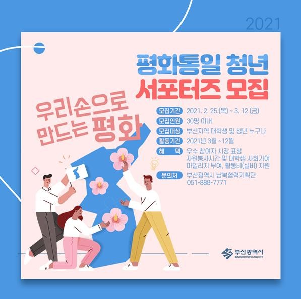 부산시(시장 권한대행 이병진)는 평화·통일에 대한 시민들의 관심 유도 및 공감대 확산을 위해 활동할「평화통일 청년 서포터즈」를 3월 12일까지 모집한다고 밝혔다.
