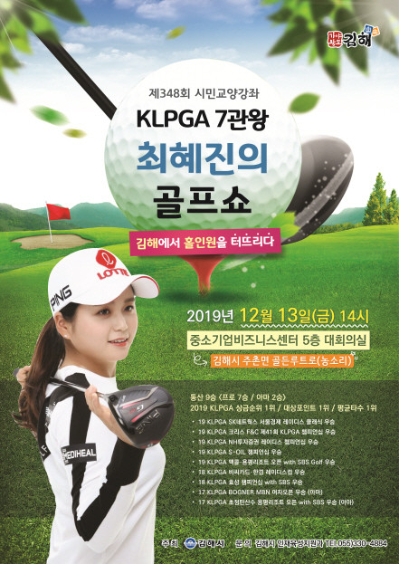 김해시(시장 허성곤)는 오는 13일 오후 2시 주촌면 중소기업비지니스센터 대회의실에서 KLPGA 7관왕 최혜진 선수를 초청해 12월 시민교양강좌를 개최한다고 밝혔다.