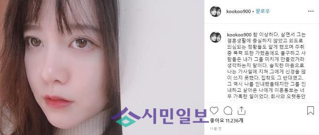 이어 "솔직히 내가 그에게 신경을 많이 쓰지 못한 것은 맞다. 그렇지만 인내하고 살아온 나에게 이혼 통보는 너무 가혹하다"면서 "회사(소속사)와 오랫동안 이혼 소송 준비를 한 사실을 알게 된 안사람이 어떤 심정인지 SNS를 통해 보여주고 싶었다"라고 최근 '안재현 게시물'을 올린 이유를 밝혔다.