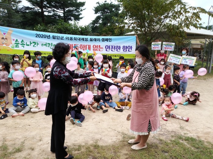 9월 23일 숲속나라어린이집을 시작으로 다음 달 9일까지 실시하는 이 릴레이 캠페인은 ‘아동학대 없는 안전한 함안’을 슬로건으로 코로나19 상황을 고려하여 각 어린이집마다 차례로 실시한다.