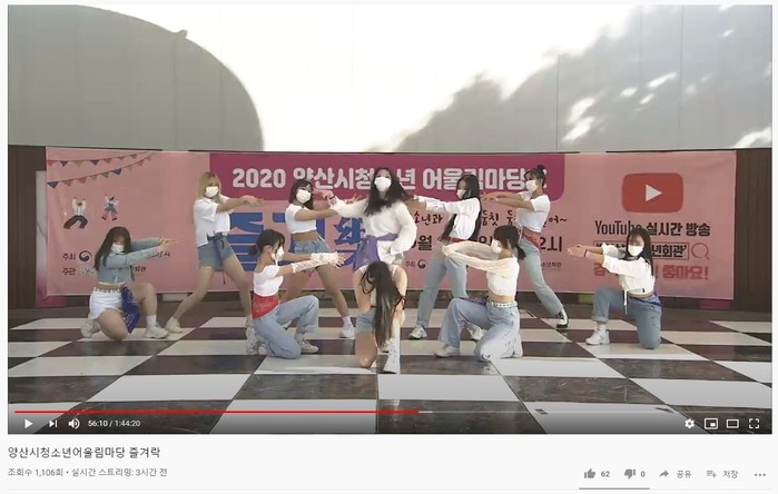 유튜브 ‘양산시청소년회관’ 공식채널에서 실시간 진행하였으며 10월 24일(토) 오후 2시 ‘양산시청소년문화의집 동아리축제’에는 최대 동시 시청자 129명이, 10월 25일(일) 오후 2시 [즐겨樂]에는 최대 동시 시청자 172명이 함께했다.