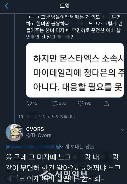 이에 한서희는 정다은의 트위터 계정으로 "응 근데 그 미자때 느그XX랑 내XX랑 같이 무면허 한건 알아? 어쩌냐 느그XX도 이제 예비 살인마 -한서희-" 라고 남기며, 몬스타엑스에서 탈퇴한 원호가 미성년자 시절 무면허 운전을 한 사실을 추가로 폭로하며 누리꾼들의 갑론을박이 이어지고 있다.