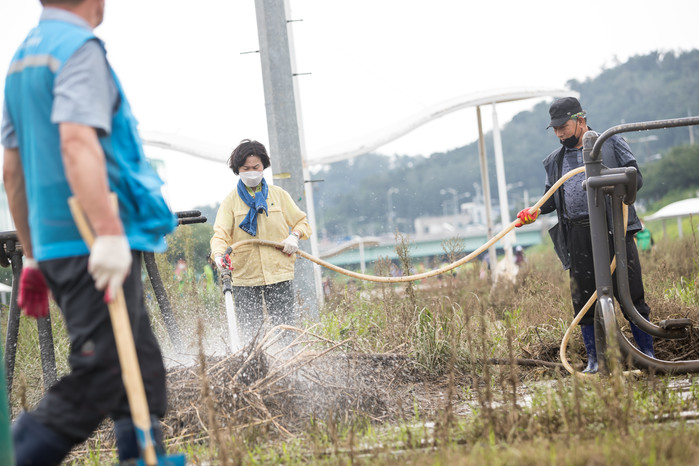 김수영 양천구청장이 8월 13일 14시 안양천 일대에서 지역주민과 자원봉사자 및 환경단체 회원 450여명과 함께 “안양천 침수 복구 대청소”를 진행했다. 사진은 복구작업중인 김수영 구청장의 모습.