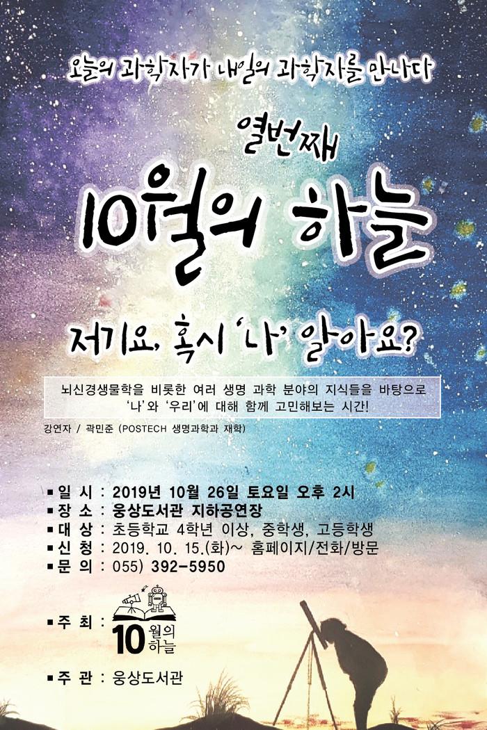 양산시 웅상도서관은 오는 26일 관내 초·중·고등학생을 대상으로 ‘10월의 하늘-오늘의 과학자가 내일의 과학자를 만나다’를 운영한다.