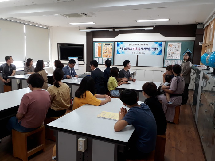 이번 환우 돕기 발전기금 전달식은 지난 5일 오후 3시 학교 과학실에서 한통건업(주)부산레미콘 임직원 뿐만 아니라 학교운영위원장, 학부모회장, 학부모, 전교학생회 회장단, 교원 등이 참석한 가운데 열렸다. 이날 전달식에 자리를 함께한 학부모들과 학생들은 환우들의 쾌유를 돕는 활동을 계속 하기로 해 주목을 받고 있다.
